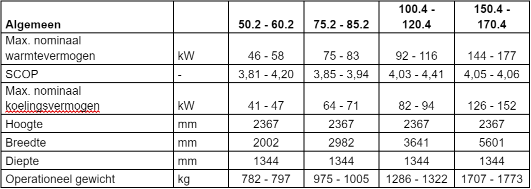- Koelingsvermogen van 40 kW tot 135 kW;