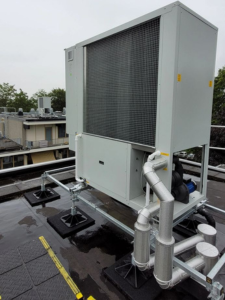 In een wooncomplex aan het Damsport in Groningen zijn 2 warmtepompen van Eco Heating Systems in gebruik genomen. De warmtepompen zijn gekoppeld aan de cv-installatie, waardoor er een hybride systeem is gecreëerd. De combinatie van warmtepomp en cv-ketel zorgt voor een optimale energie-efficiëncy. De warmtepomp neemt het grootste deel van de verwarming voor haar rekening. De cv-ketel springt alleen bij tijdens piekbelasting.